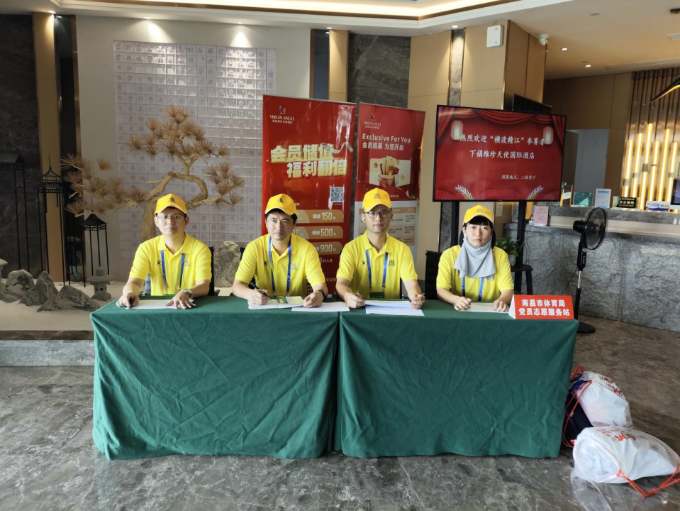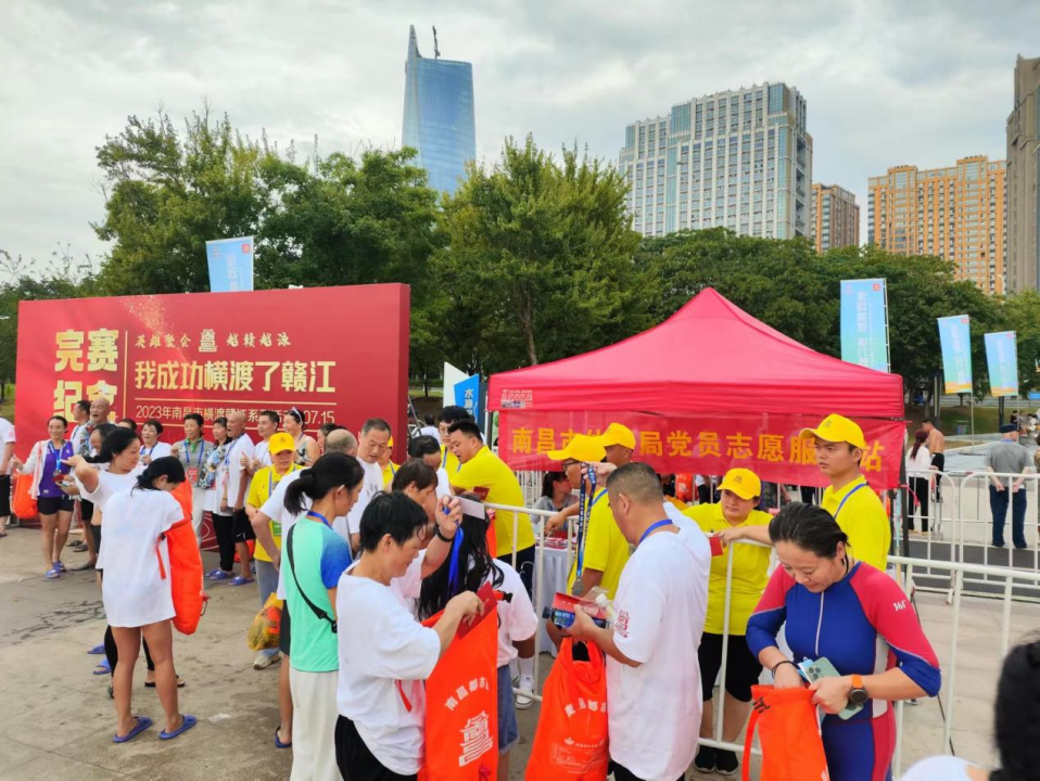 尽心保障赛事现场服务。赛事期间,中心党员志愿者队伍组织参赛队伍有序参加运动员酒精检测及检录工作,主动配合民警做好接送工作,主动作为,原则上做到参赛运动员团进团出,不落一人。在宣传、服务方面,中心学习国内优质赛事成功经验,对赛事活动中的下水区、起水区等重要点位进行精心布置,对氛围营造、赛会保障服务进一步优化,最大程度方便参赛者。同时中心还组织志愿者团队,在赛事活动现场设立党员志愿服务站,以饱满的热情为参赛选手引导检录、递送补给、维持秩序、发放完赛奖牌等,用细心、耐心和专业的服务为此次南昌市2023年横渡赣江活动保驾护航。